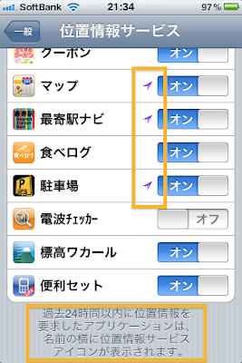 これは 設定 >> 一般 >> 位置情報サービス を表示したところです。位置情報を要求するアプリは、最初の起動時や最初に位置情報サービスを使う際に「位置情報を取得しますがよろしいですか?」などのようにメッセージを出して、ユーザがどうするか選択できるようになっています。